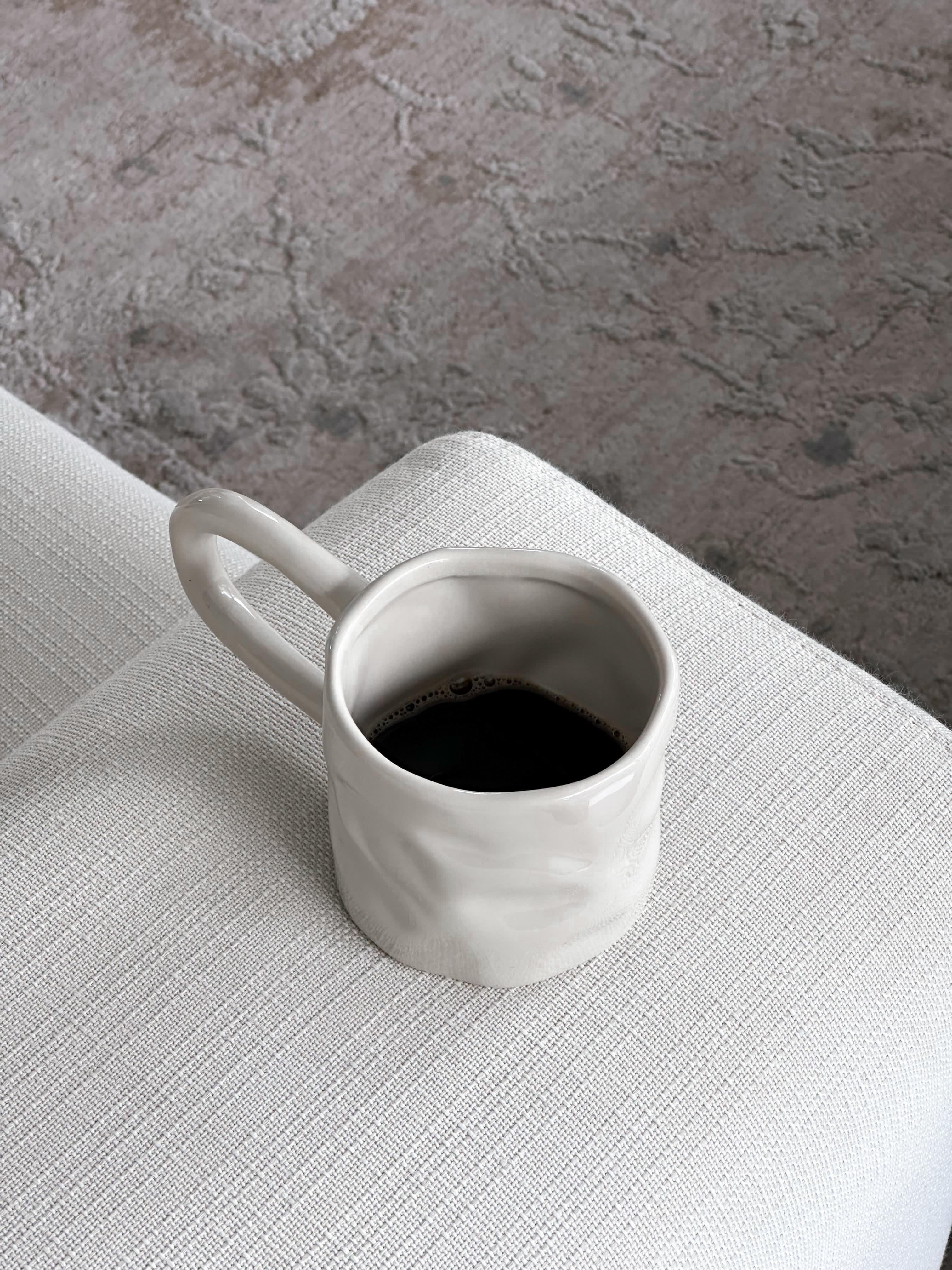 Unique handmade ceramic mug with an irregular design, perfect for coffee or tea lovers